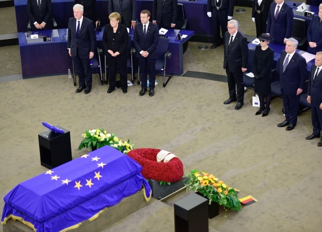 E come al solito concludiamo i nostri post con una immagine significativa. In foto la compagnia di giro che attualmente regge (nominalmente, s’intende) l’Europa ai funerali di Helmut Kohl. Un uomo che fece tanto per l’Europa e che ne avrebbe sicuramente costruito una differente. Ma oramai così è andata, l’Europa non c’e’ piu’ e dovremo farcene una ragione. Speriamo si salvi il salvabile e che per farlo non muoia troppa gente.